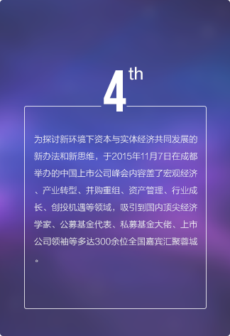 上市公司領(lǐng)袖峰會是由每日經(jīng)濟(jì)新聞主辦的中國資本市場最具影響力的大型交流平臺,最重要的年度盛會之一,峰會自2011年發(fā)起,迄今已經(jīng)連續(xù)舉辦五屆。2017年第六屆中國上市公司領(lǐng)袖峰會將以“新時代 新機遇 新?lián)?dāng)”為主題,匯聚中國數(shù)百家優(yōu)秀上市公司、上百家券商基金機構(gòu),邀請政府官員、商界領(lǐng)袖、學(xué)界專家齊聚成都,共話財經(jīng)宏圖與資本愿景。