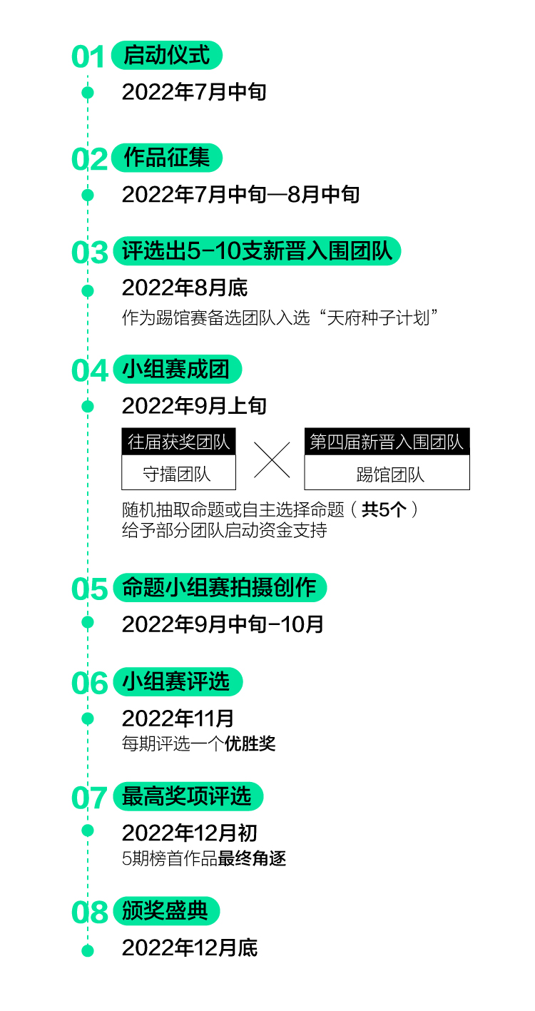 為鼓勵視頻創(chuàng)作,2022年將繼續(xù)啟動“天府種子計劃”,高標準、高質(zhì)量生產(chǎn)以成都為主題/背景的影像IP。該計劃將通過“揭榜掛帥”的模式,發(fā)布5-10個提供啟動資金的“種子”項目,通過邀請社會報名、機構推薦的形式,征集評選出視頻行業(yè)有潛力的承接團隊、個人。主辦方將組織專業(yè)評審對入圍團隊/個人遞交的資料進行評議打分,選出各個“種子”項目的承接方并予以執(zhí)行。